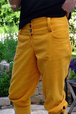 … ist meine Kniebundhose aus gelbem Cord. Die habe ich im Sommer auch abgöttisch geliebt. Der Schnitt stammt aus einer uralten Burda von 2006. Der Stoff gibt dem Teil den richtigen Pfiff und die Bundlösung finde ich so super und so bequem, dass ich mir im nächsten Jahr einen Schnitt für eine weitere Cordhose daraus bastel, nur dass die dann lange Hosenbeine mit leichtem Schlag haben soll.