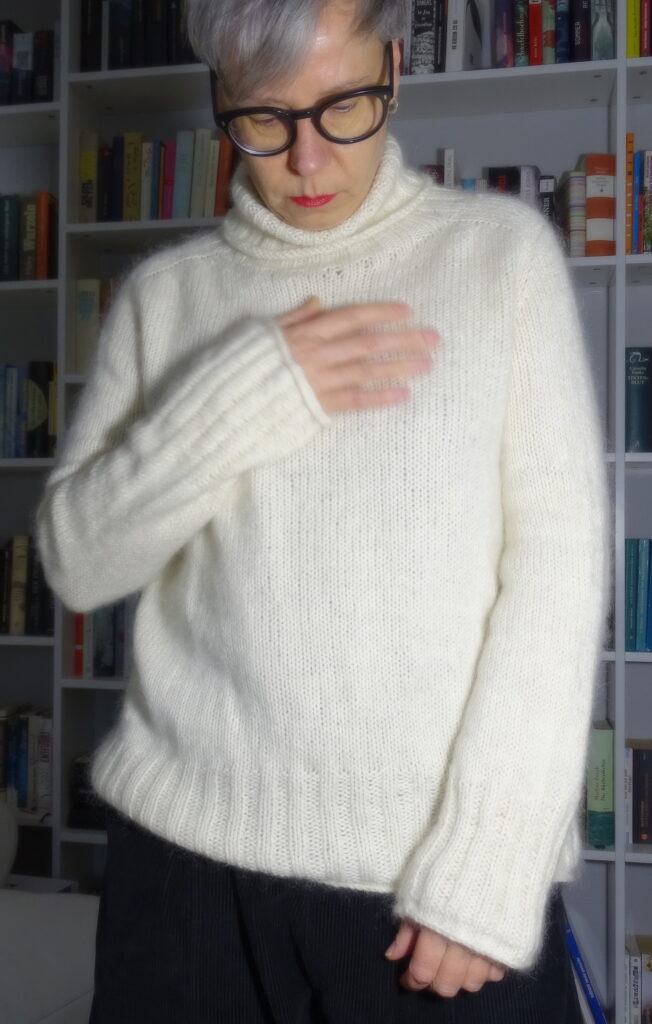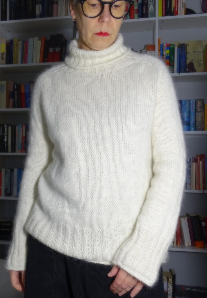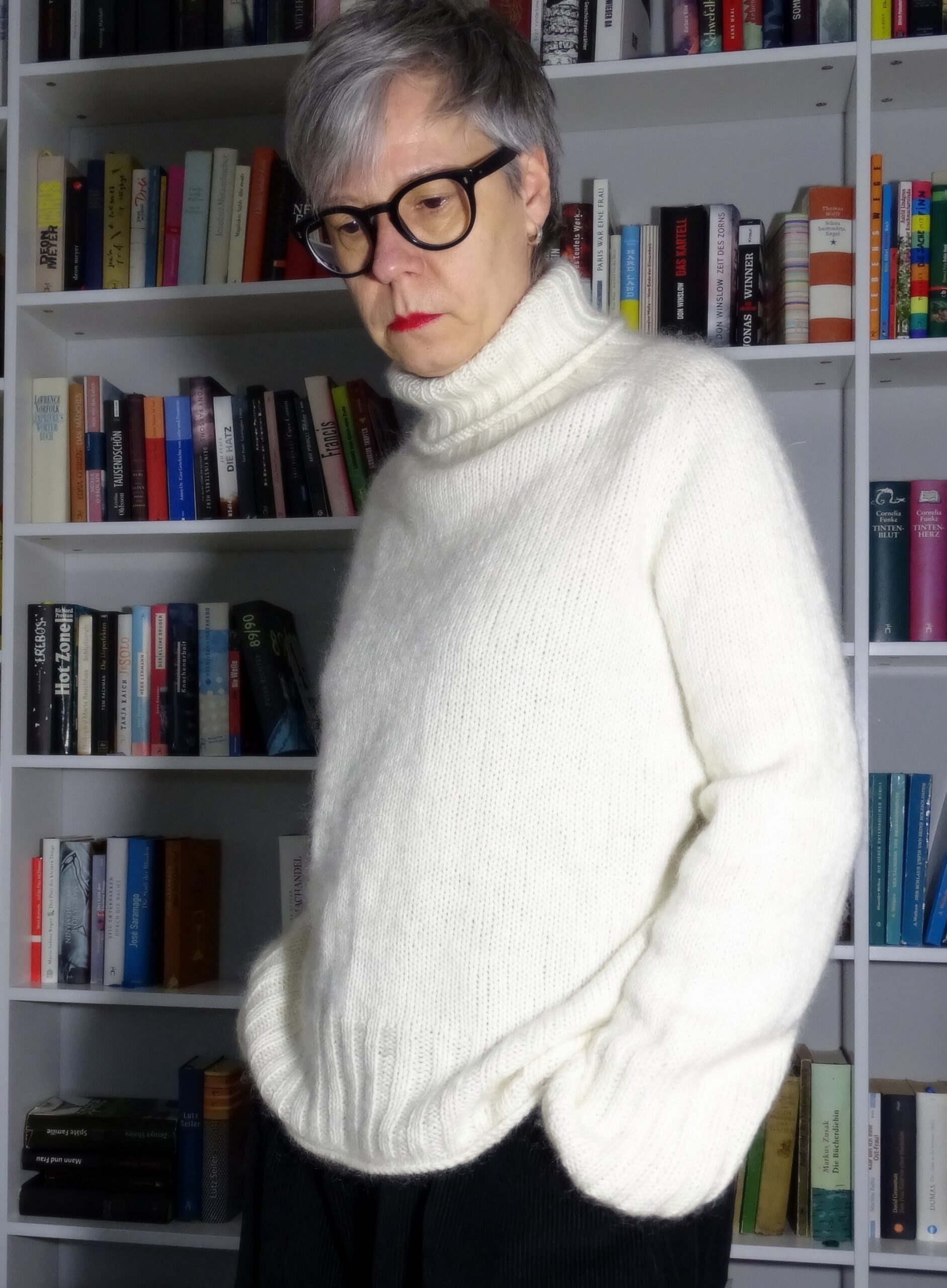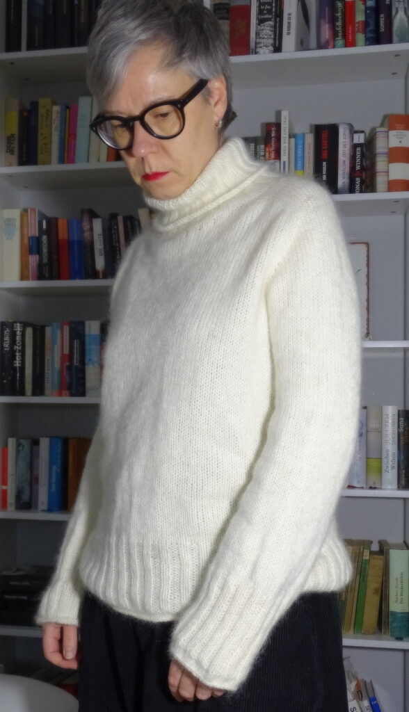 Ein einfaches rechtes Muster ließ den Pullover schnell wachsen. Der Pullover wird von oben nach unten und in einem Stück gestrickt. Die Schulterpartie ist ungewöhnlich konstruiert, sieht aber komplett unspektakulär aus. Die Abschlüsse beim Rollkragen und den Bündchen werden nach dem Bündchenmuster mit jeweils 3 Runden glatt rechts abgeschlossen. So entsteht ein kleiner Rollrand.