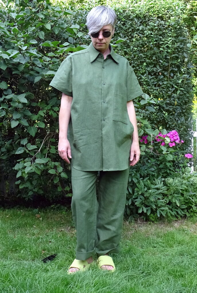 Und da der Geburtstag meines Lebensgefährten kurz vor der Tür stand, hatte ich die Idee, uns das Hemd im Partnerlook zu nähen. Ich hab auf bereits bewährte Schnitte von Ann Ringstrand zurückgegriffen. Das Hemd ist das Saint Shirt in der kurzärmeligen Variante – für den Mann in Größe L, für mich in Größe M, die Hose ist die Key Trouser.