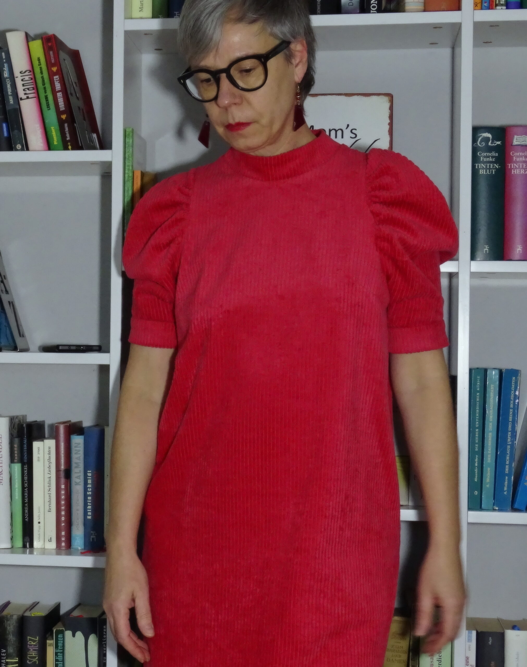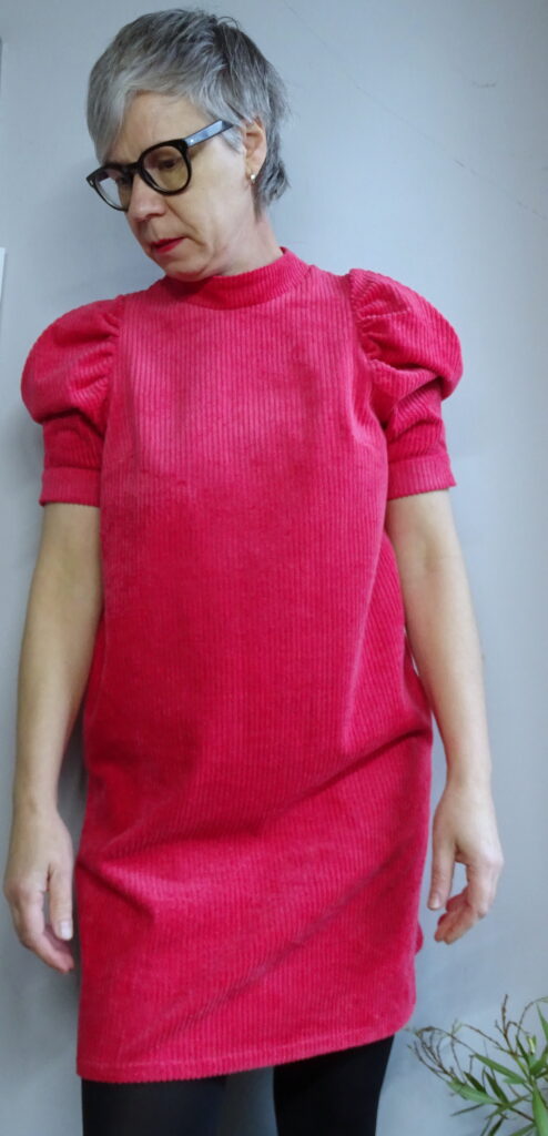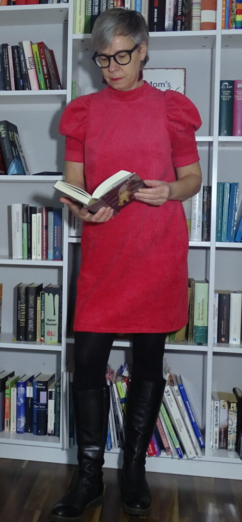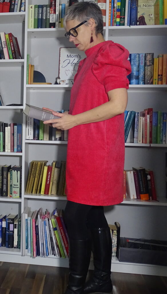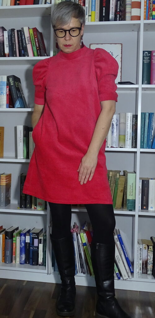 Mir gefällt der Schnitt wirklich gut, das Rot hat zum einen den weihnachtlichen Touch, der Breitcord ist bestens für ein Winterkleid geeignet.